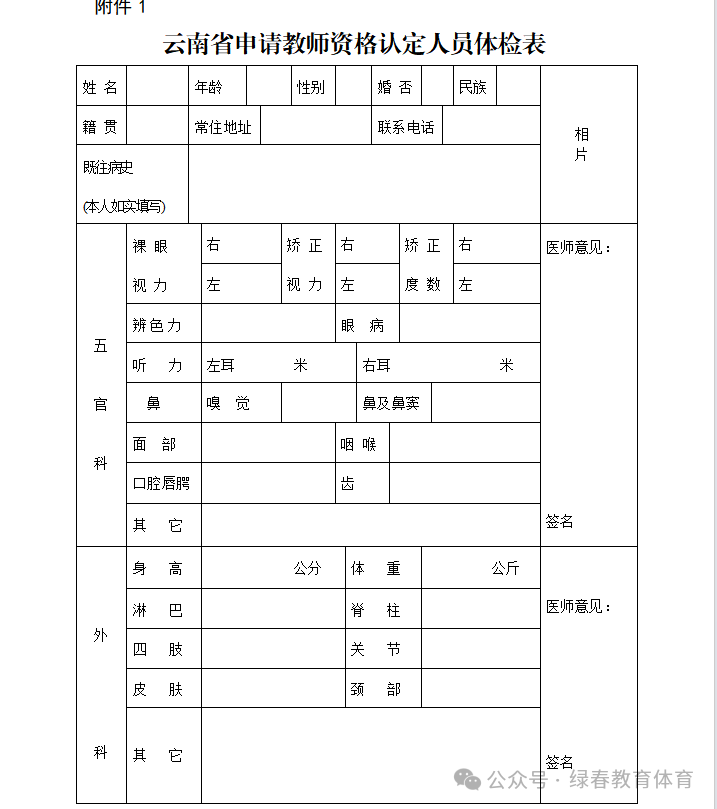 ①《云南省申请认定教师资格人员体检表》(附件1)由申请人下载双面打印后,粘贴本人一寸照片自行到认可医院体检。