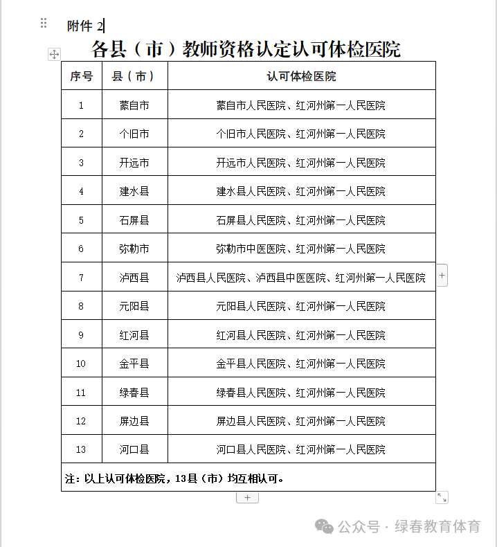 (7)《云南省申请教师资格认定人员体检表》原件(见附件1)。经红河州辖区内县级以上公立医院体检后(认可体检医院详见附件2),体检结论签署 “合格”且有体检医院意见并加盖公章的《云南省教师资格认定体检表》原件,体检报告仅限当次认定有效。