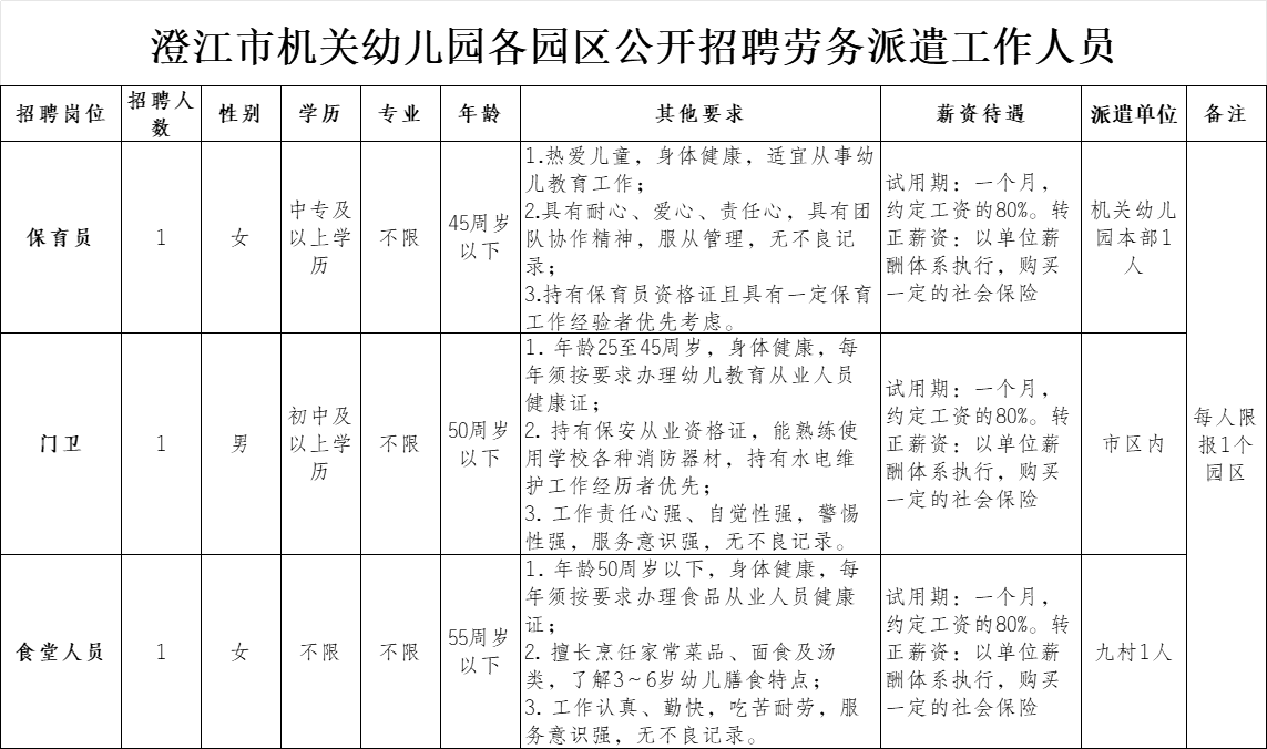 澄江市机关幼儿园各园区公开招聘劳务派遣工作人员公告