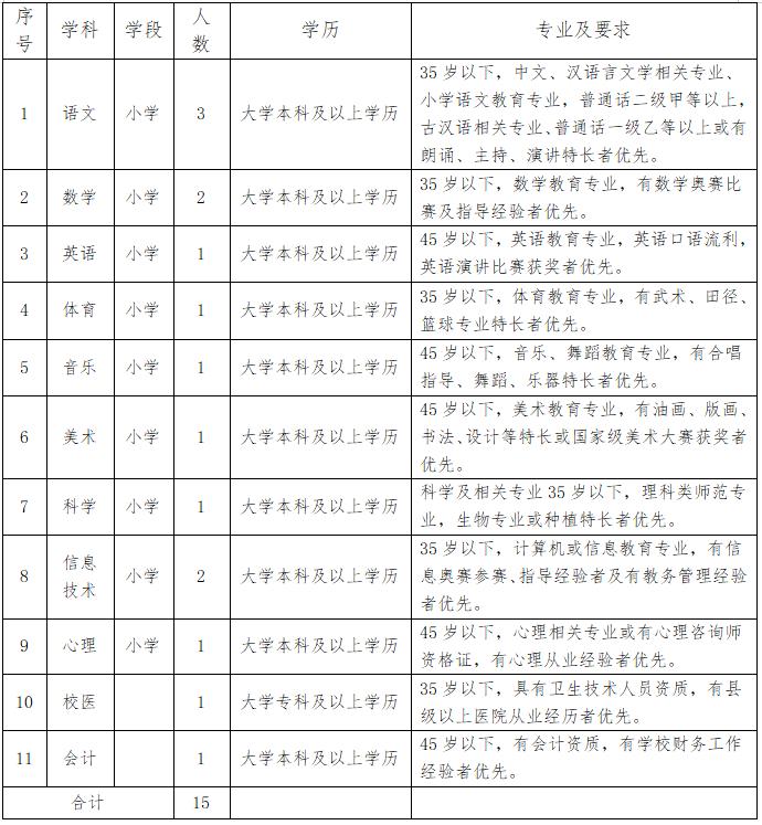 持有应聘岗位相应学科相应等级的教师资格证(应届毕业生可适当放宽,考核通过正式入职前取得即可);普通话水平须二级乙等及以上(语文学科岗位须二级甲等及以上);获得市级骨干教师、学科带头人、教坛新秀等称号的教师同等条件下优先考虑。