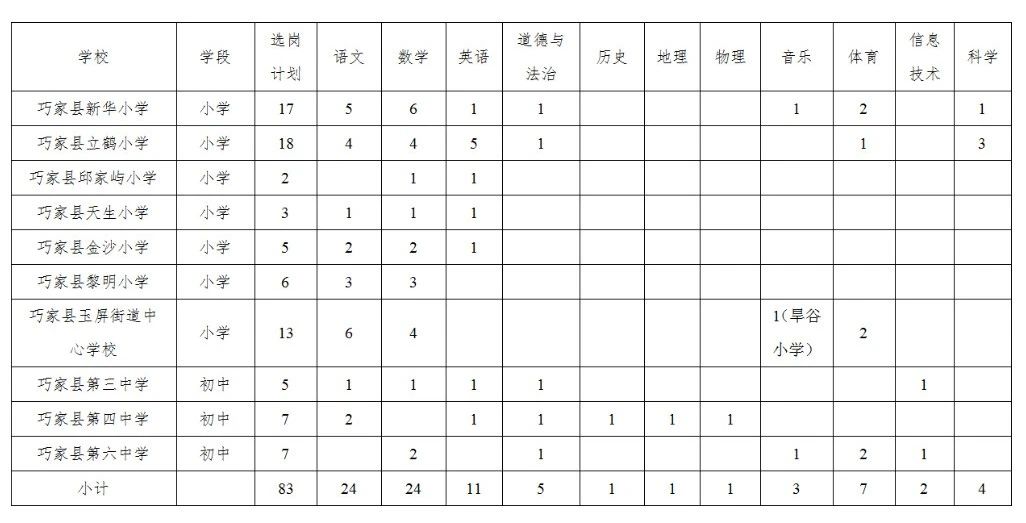 此次公开选岗岗位83个,各学段各学科岗位计划如下: