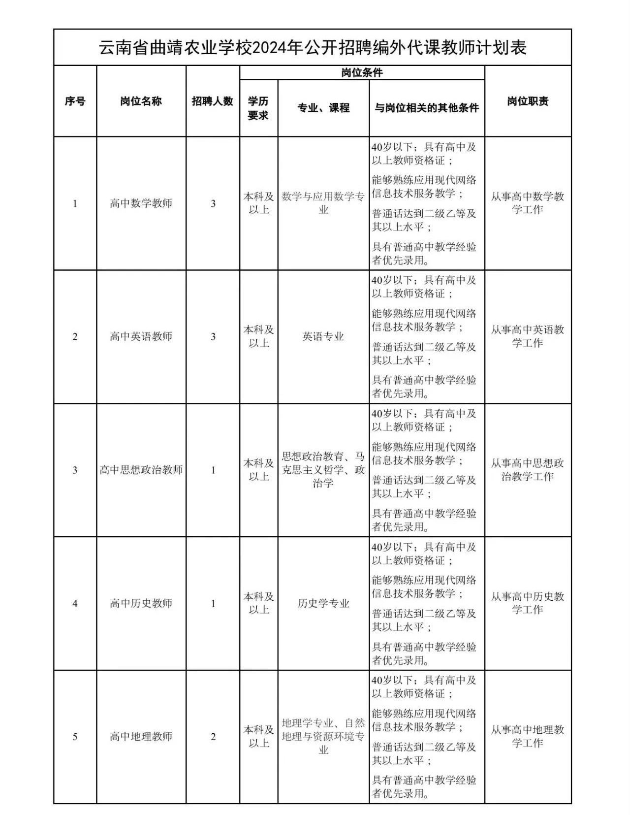 云南省曲靖农业学校2024年公开招聘编外代课教师