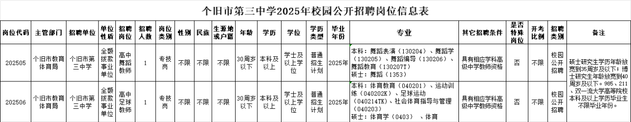 附件1.个旧市第三中学2025年校园公开招聘岗位信息表.xls