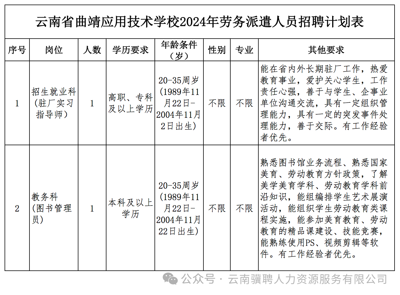 云南骥聘人力资源服务有限公司受云南省曲靖应用技术学校委托,面向社会公开招聘劳务派遣人员2名。公司将按照劳务派遣的相关规定,结合用人单位工作实际要求,严格遵循“公开、平等、竞争、择优”的原则,严格考核、择优聘用,现将有关事项公告如下: