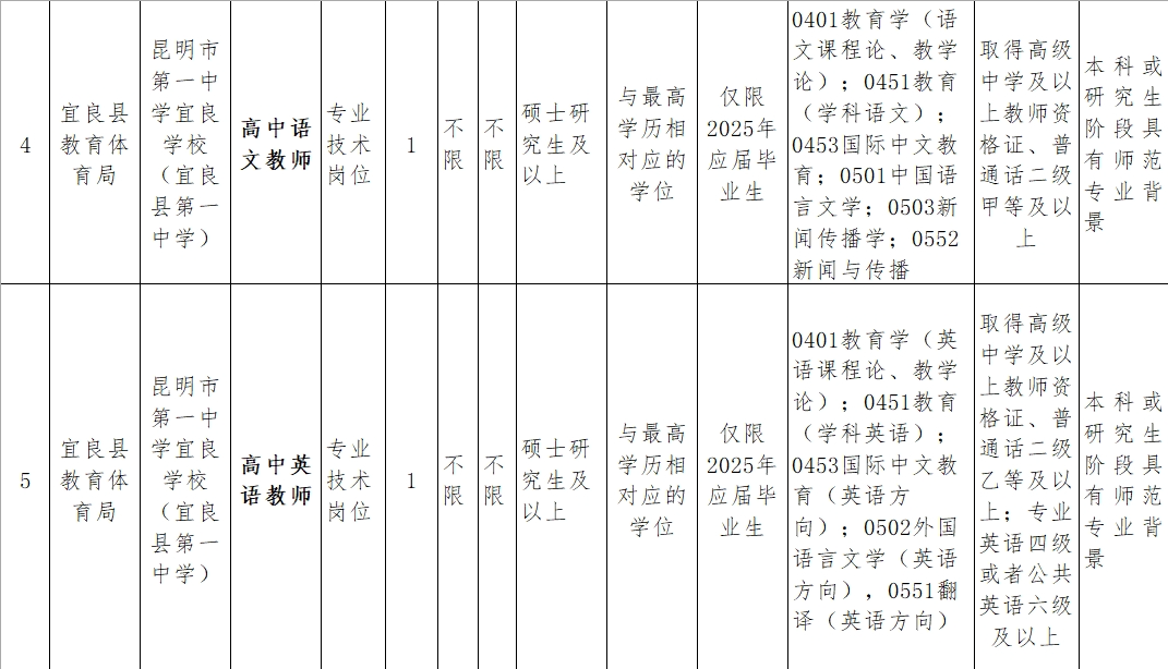 昆明市第一中学宜良学校2025年人才引进岗位设置表