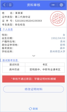 2.若因材料上传不正确、不全而审核结论未获通过的考生请根据反馈提示,在规定时间内更正信息或修正上传审核材料,截止时间为11月14日中午12:00。