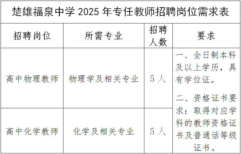 楚雄福泉中学关于2025年公开招聘部分学科专任教师的公告(一)
