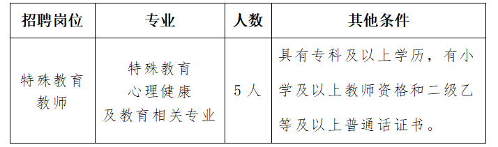 5.有特殊教育专业背景;有从事小学相关学科教学、班主任工作经历者优先聘用。