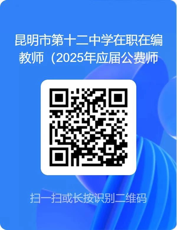 2.报名方式:登录昆十二中教育集团微信公众平台查看招考公告,扫描二维码,填写电子报名表单,简历投递邮箱。
