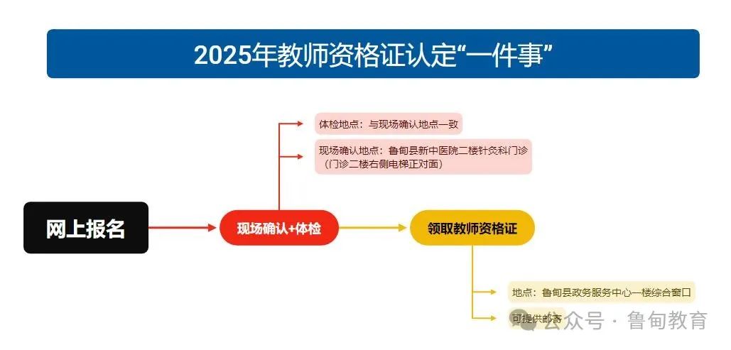 本次现场确认将采取教师资格证认定“一件事”方式进行高效集中办理,鲁甸县政务服务中心将在鲁甸县中医院设置现场审核窗口,申请人直接到县中医院“教资审核窗口”处提交户口本原件复印件(复印户主及本人页)及白底照片一张,审核通过的同时现场领取体检表,在引导人员的指引下通过“教资认定绿色通道”进行体检,体检结果由医院统一推送,申请人体检完即可离开。“一站式”办理为您节约宝贵时间。制证完成后您可到县政务服务中心一楼综合窗口领取,如您不便亲自领取,可采用邮寄方式送达,体检及邮寄费用自理。(为方便办理,本次教师资格证认定“一件事”选取鲁甸县中医院为试点合作医院,如您不便到鲁甸县中医院体检,可自行在其他县级及以上公立医院体检(体检结论必须署名合格或不合格)并到鲁甸县中医院教资现场确认点进行现场确认)