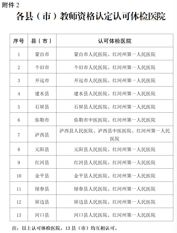 (7)《云南省申请教师资格认定人员体检表》原件(见附件1)。经红河州辖区内县级以上公立医院体检后(认可体检医院详见附件2),体检结论签署“合格”且有体检医院意见并加盖公章的《云南省教师资格认定体检表》原件,体检报告仅限当次认定有效。