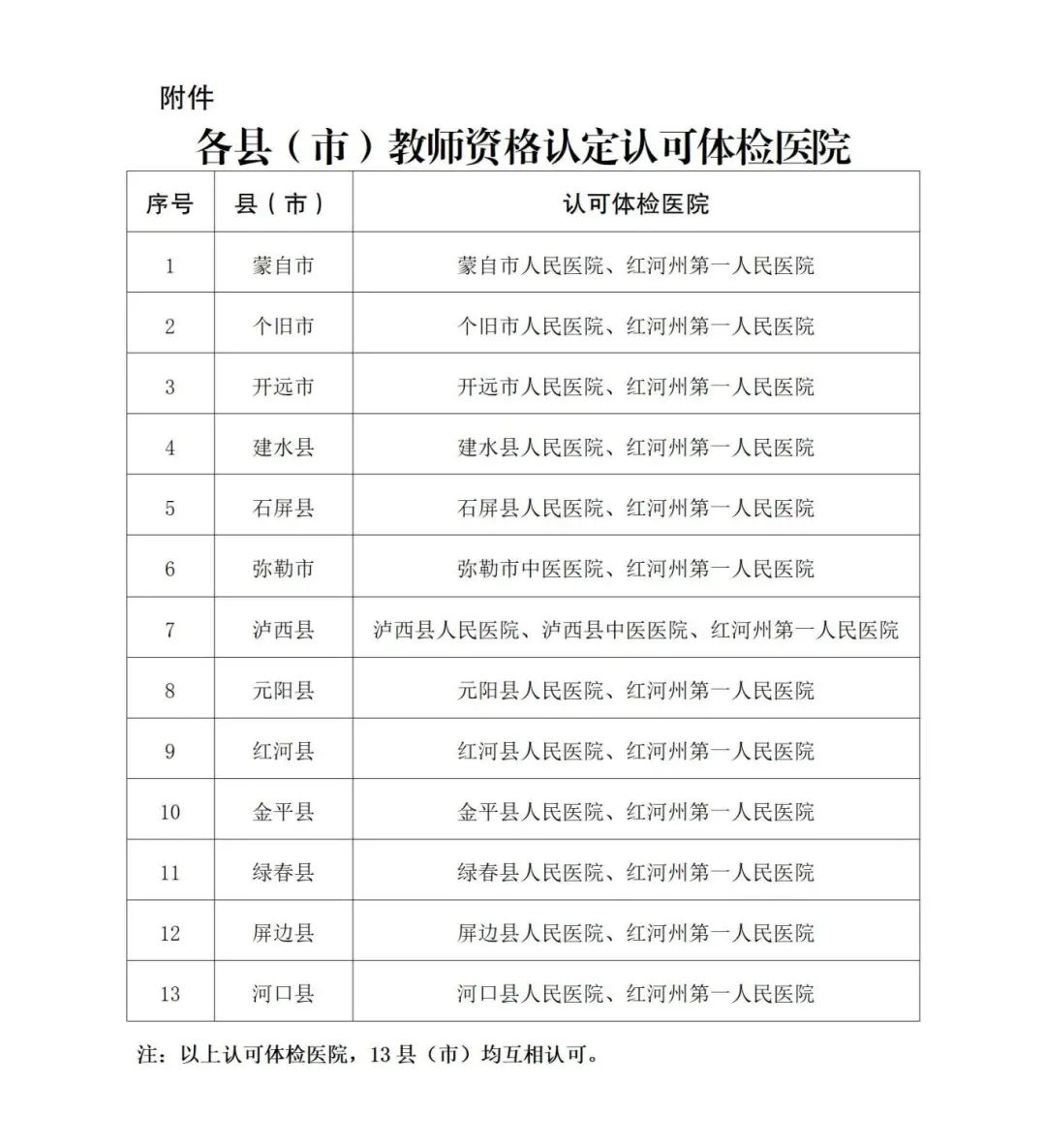 (四)能适应教育教学工作的需要,具有良好的身体素质和心理素质。申请人须按照《教育部教师资格认定指导中心关于调整申请认定幼儿园教师资格人员体检标准的通知》(教资字〔2010〕15号)、《人力资源和社会保障部教育卫生部关于进一步规范入学和就业体检项目维护乙肝表面抗原携带者入学和就业权利的通知》(人社部发〔2010〕12号)、《云南省申请教师资格人员体检办法》(详见省教育厅公告)要求,在教师资格认定机构认可的县级以上医院体检合格(红河州认可医院详见附件)。