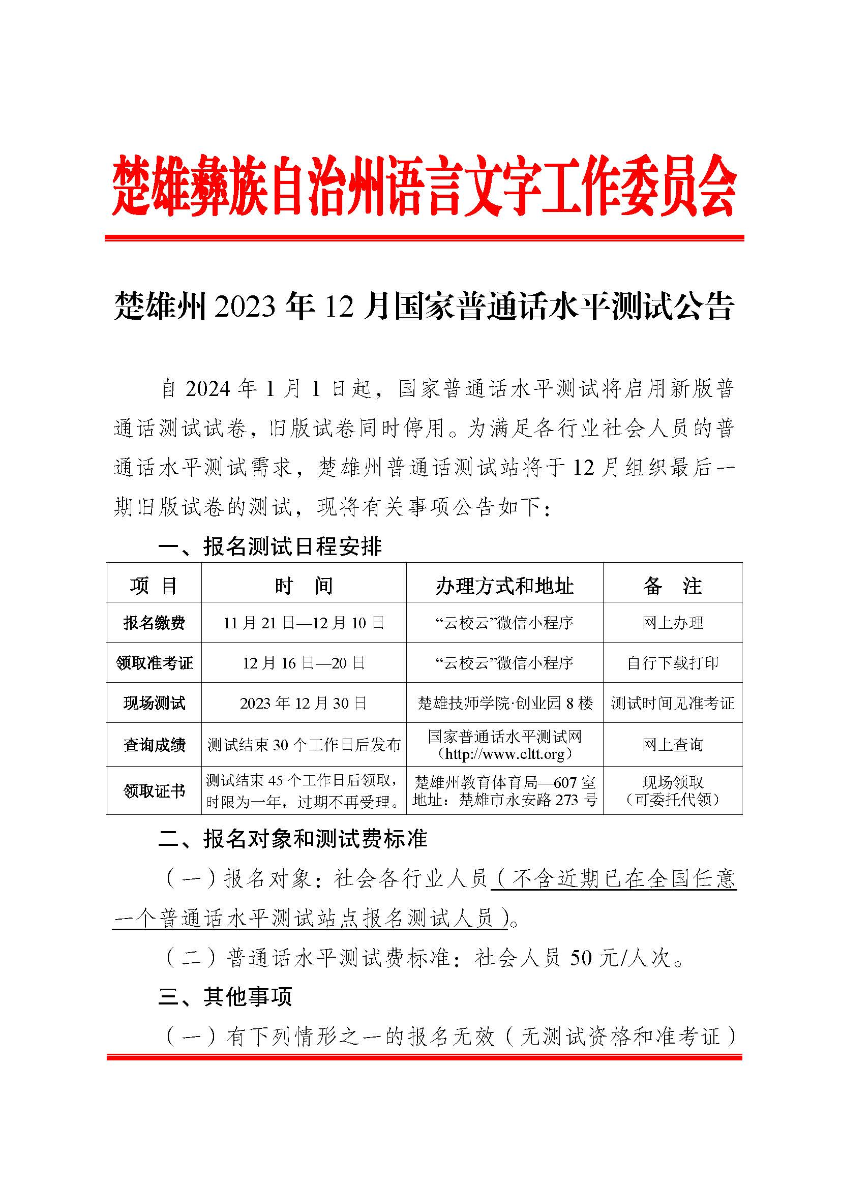 2023年12月楚雄州国家普通话水平测试公告