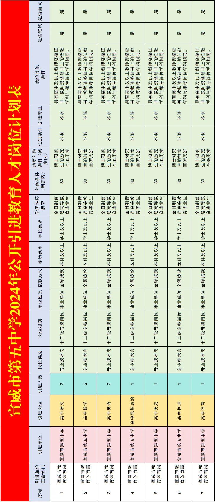 宣威市第五中学2024年计划引进个学科教师10人。其中语文2人,数学2人,英语2人,思想政治1人,历史1人,物理1人,体育1人。具体资格条件见附件1《宣威市第五中学2024年公开引进教育人才专项岗位计划表》。
