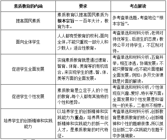 素质教育的内涵在综合素质里面属于常考考点,主要考查的是单选题和材料分析题,想要考高分,我们就要充分了解它的出题角度。
