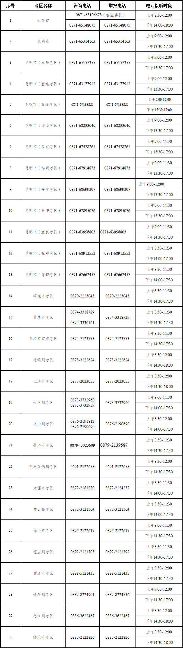 云南省2025年下半年中小学教师资格考笔试各考区咨询及举报电话