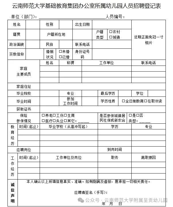 应聘者按照招聘条件和要求,持自己的求职材料:《云南师范大学基教集团办公室所属幼儿园人员招聘登记表》及自荐书、简历、身份证等原件、复印件和有关证明材料,扫描件发送至邮箱326918729@qq.com进行报名。