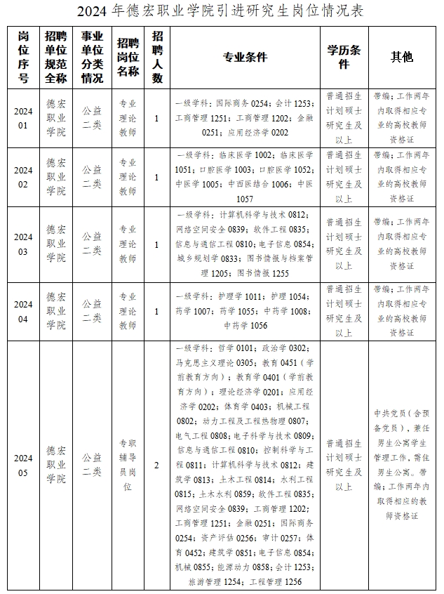 根据《云南省事业单位公开招聘工作人员办法》(云人社发〔2016〕182号)等有关规定,经德宏州人力资源社会保障局批准,2024年德宏职业学院面向社会公开引进研究生6名,现将有关事项公告如下: