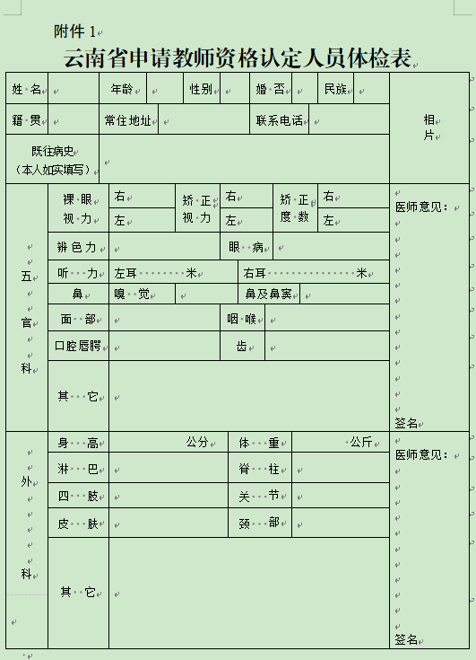 附件:1.云南省申请教师资格认定人员体检表