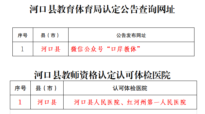 (7)《云南省申请教师资格认定人员体检表》原件(见附件2)。经红河州辖区内县级以上公立医院体检后(认可体检医院详见附件3),体检结论签署 “合格”且有体检医院意见并加盖公章的《云南省教师资格认定体检表》原件,体检报告仅限当次认定有效。
