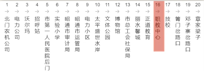 汽车客运站→→火车站方向路线:汽车客运站→远大广场→康晟花园→昭通烟厂→望海公园→民欣花园→养征稽查大院→移动全球通大楼→昭苑小区→滇东北机动车商贸城→特殊教育学校→昭通日报社→昭阳宾馆→市中医院老院→电影院→清官亭→北门农机公司→沃尔玛→市第一人民医院后门→实验小学(到站下车)。