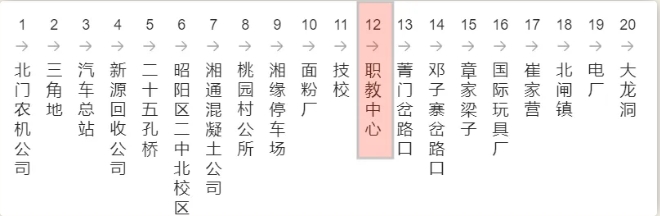 火车站→→汽车客运站方向路线:火车站→石渣河九组→农机卡车交易市场→陈家院子→综合批发大市场→陈家海子→中级人民法院→昭通市公安局→市总工会(社保局)→博物馆→广电中心→文体公园→电力小区→昭通市运管局→昭通市审计局→实验小学(到站下车)。