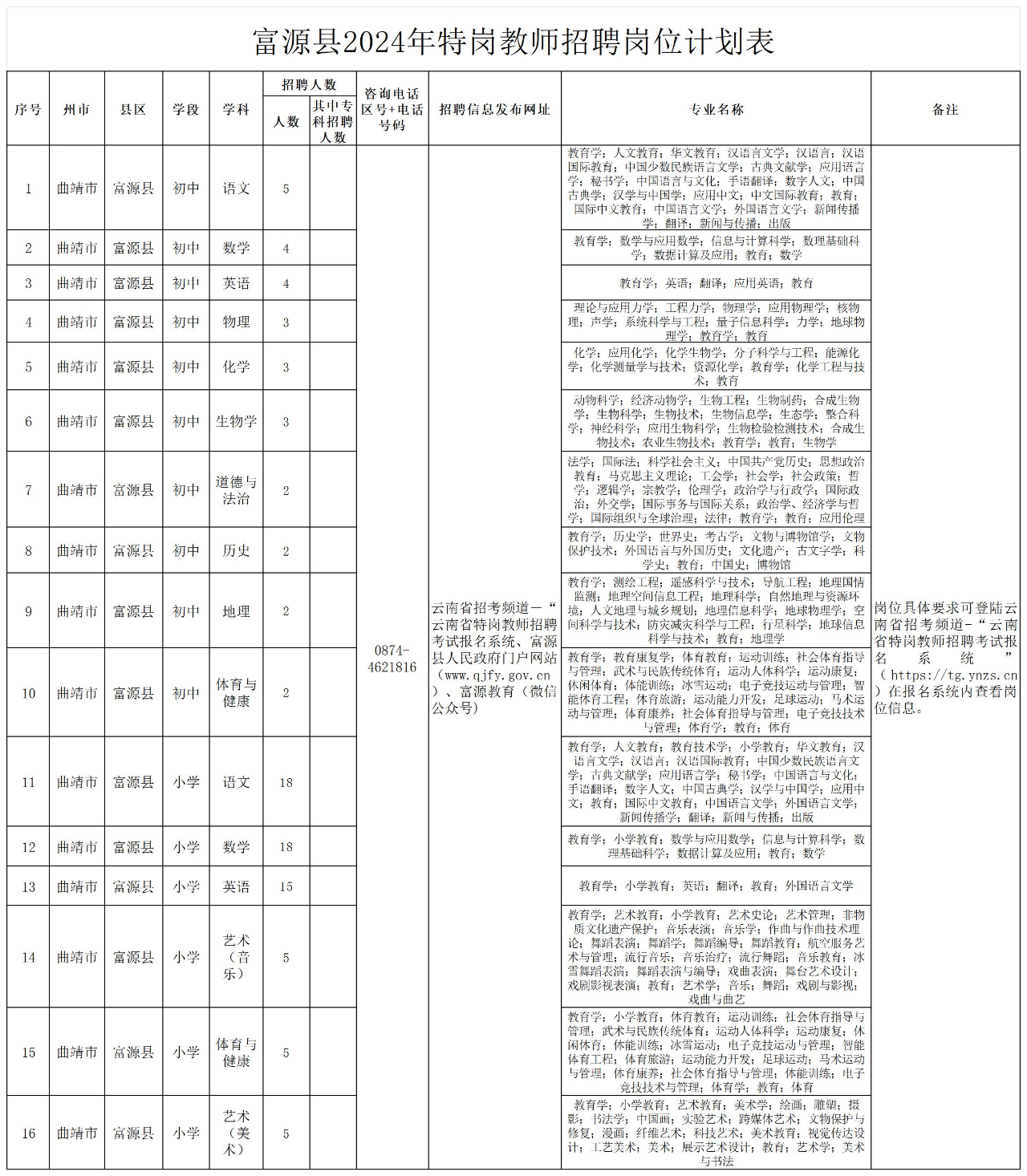 根据《教育部办公厅 财政部办公厅关于做好2024年农村义务教育阶段学校教师特设岗位计划实施工作的通知》(教师厅〔2024〕1号)和《云南省教育厅关于组织实施2024年特岗教师招聘工作的通知》文件精神,现将富源县2024年特岗教师招聘考试有关事项公告如下:
