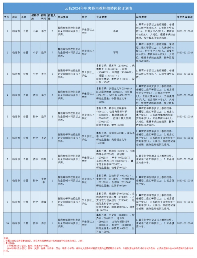根据《教育部办公厅 财政部办公厅关于做好2024年农村义务教育阶段学校教师特设岗位计划实施工作的通知》(教师厅〔2024〕1号)和《云南省教育厅 云南省财政厅 云南省人力资源和社会保障厅 中共云南省委机构编制办公室关于印发〈云南省农村义务教育阶段学校教师特设岗位计划实施方案〉(2012年修订)的通知》(云教人〔2012〕28号)和《云南省教育厅关于2024年中央特岗教师招聘考试的公告》精神,现将临沧市云县2024年特岗教师招聘考试有关事项公告如下: