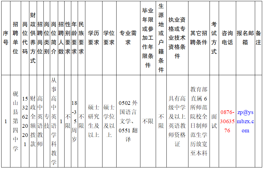 因2024年砚山县第四中学紧缺招聘高中英语教师空岗,根据《事业单位人事管理条例》(中华人民共和国国务院令652号)《事业单位公开招聘人员暂行规定》(中华人民共和国人事部令第6号)《云南省事业单位公开招聘工作人员办法》(云人社发〔2016〕182号)《2024年文山州事业单位紧缺岗位招聘通告》的规定,经州人力资源和社会保障局批准,现将砚山县2024年砚山县第四中学高中英语教师岗位第二轮招聘有关事项通告如下。