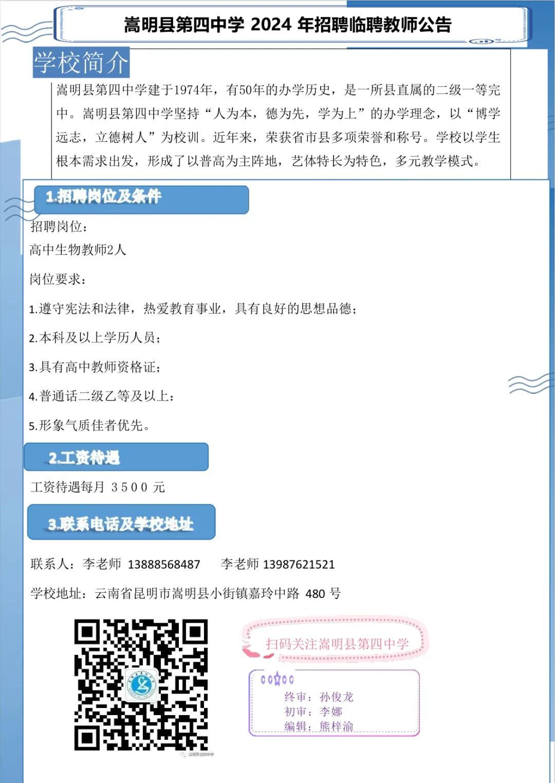 2024年7月昆明市嵩明县第四中学招聘临聘教师公告