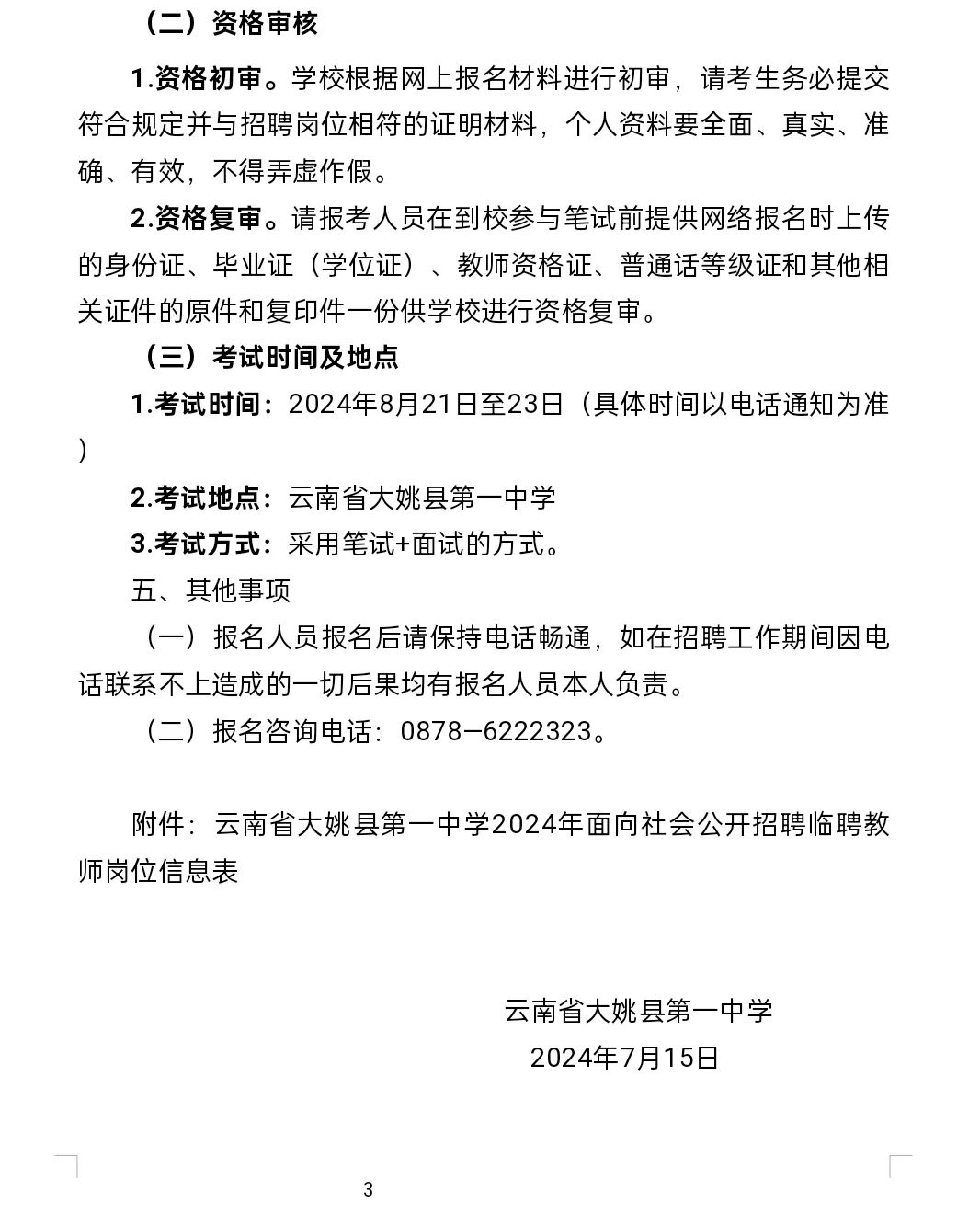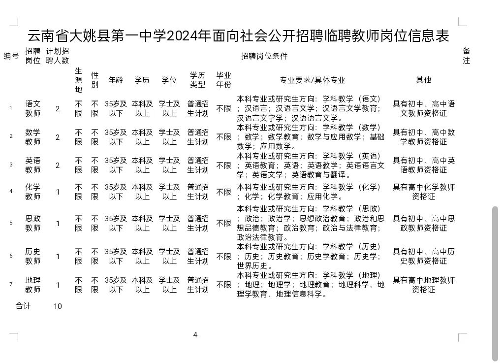 2024年云南省大姚县第一中学招聘临聘教师公告