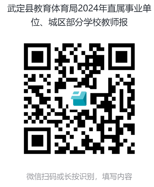 (三)报名方式:本次考试采取网络报名方式进行。报名人根据各岗位条件要求扫描公告后面二维码进行报名,下载并填写《武定县2024年教师招考流动报名表》,报名时按要求上传经原工作单位审核签字确认的报名表、身份证、最高学历毕业证、教师资格证、普通话等级证书、近五年履职考核证书、表扬表彰奖励、论文发表等证明材料PDF文档。