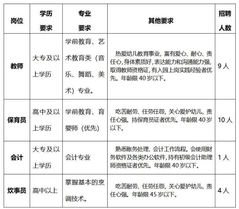 1.拥护党的路线、方针、政策,遵纪守法、爱岗敬业、品行优秀,能吃苦耐劳、责任心强、服从管理、热爱幼儿,有志于幼儿教育事业。