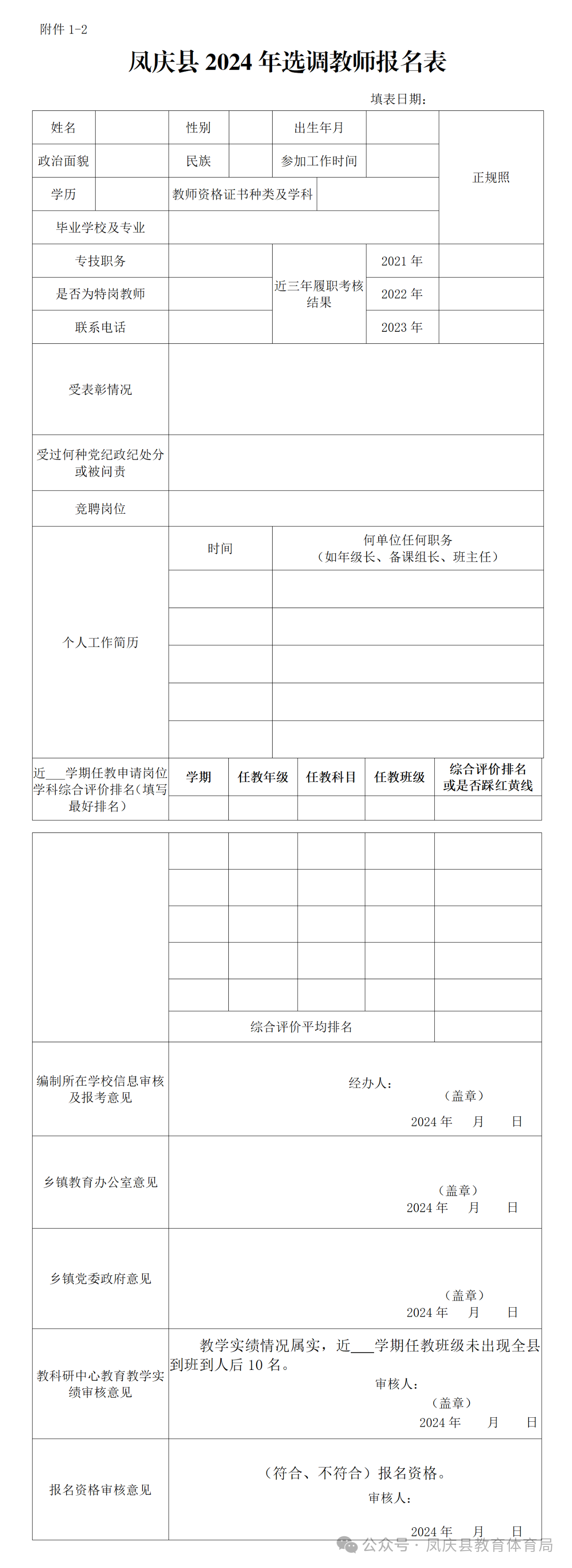 1.《凤庆县2024年乡镇之间教师调动申请表》(附件5)一份(参加县直学校选调未被录用的教师,可用原报名表)。
