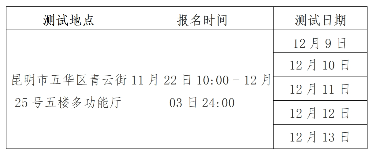 3.2024年12月计划测试5场,共6000人次。如因特殊情况需要暂停或取消考试,中心将通过“昆明市教育资源公共服务平台”及“昆明市普通话培训测试中心”微信公众号,发布暂停或取消测试的公告。已完成报名缴费的,中心将择日安排测试。