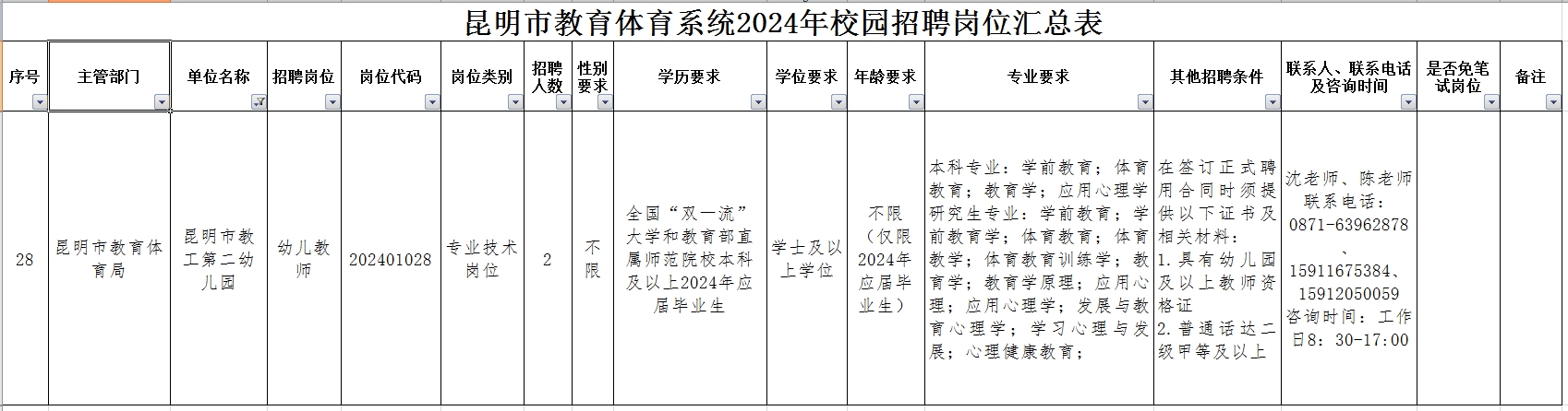具体请在昆明市教育体育系统2024年校园招聘公告中搜索查看:(https://m.bysjy.com.cn/student/chance/newsdetails.html?token=yxqqnn2600000015¬ice_id=898549&is_new_openid=1)