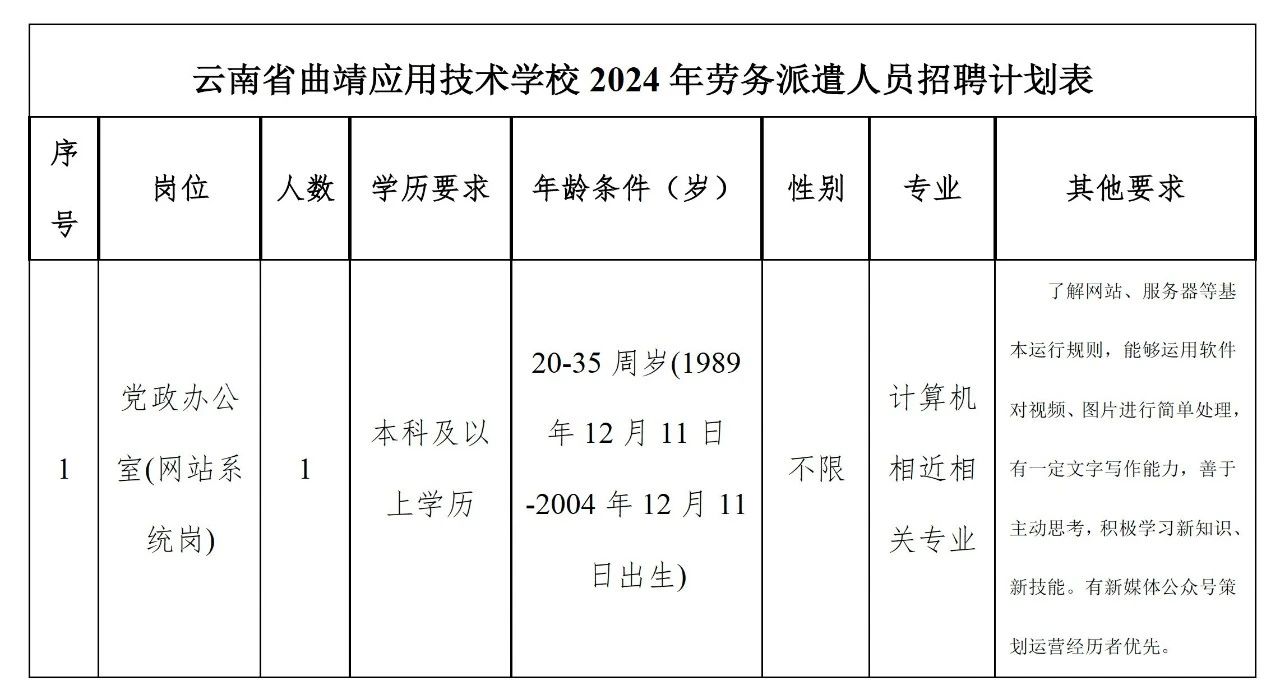 云南骥聘人力资源服务有限公司受云南省曲靖应用技术学校委托,面向社会公开招聘劳务派遣人员1名。公司将按照劳务派遣的相关规定,结合用人单位工作实际要求,严格遵循“公开、平等、竞争、择优”的原则,严格考核、择优聘用,现将有关事项公告如下: