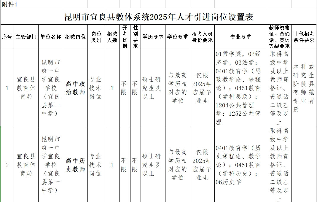 昆明市第一中学宜良学校2025年人才引进岗位设置表