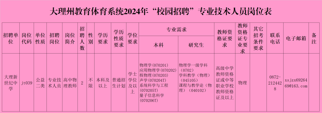 1.大理州教育体育系统2024年“校园招聘”专业技术人员岗位表