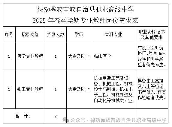 招聘公告通过县教体局、禄劝职业高级中学公众号发布。自发布之日开始报名。