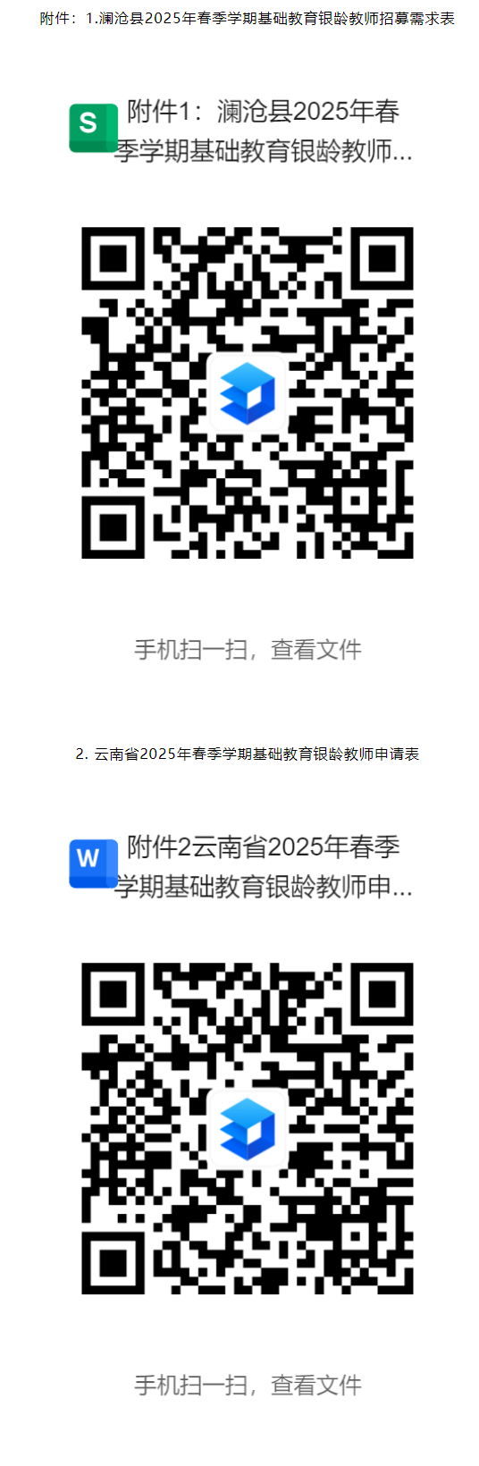 2025年春季学期澜沧县计划招募“银龄讲学计划”讲学教师12名,具体招募岗位要求、人数和工作人员联系方式详见《澜沧县2025年春季学期基础教育银龄教师招募需求表 》(附件1)。