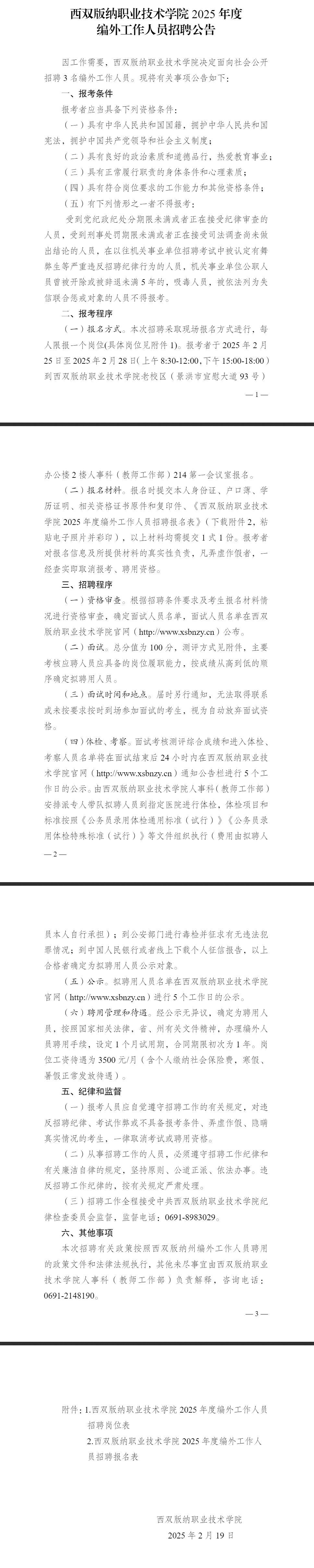 2025年西双版纳职业技术学院编外工作人员招聘公告