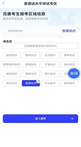 完成实名认证后,在APP首页找到“普通话测试报名”,点击进入普通话水平测试专区界面,选择“云南省普通话培训测试中心”后,点击“进入首页”。