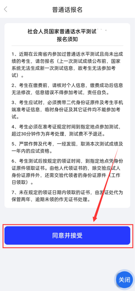 2.仔细阅读“社会人员国家普通话水平测试报名须知”,点击“同意并接受”,进入信息确认界面;考生可对“测试点”进行选择,“工作单位”非必填,信息确认并填写完成后,点击“确定并缴费”,完成安全验证。