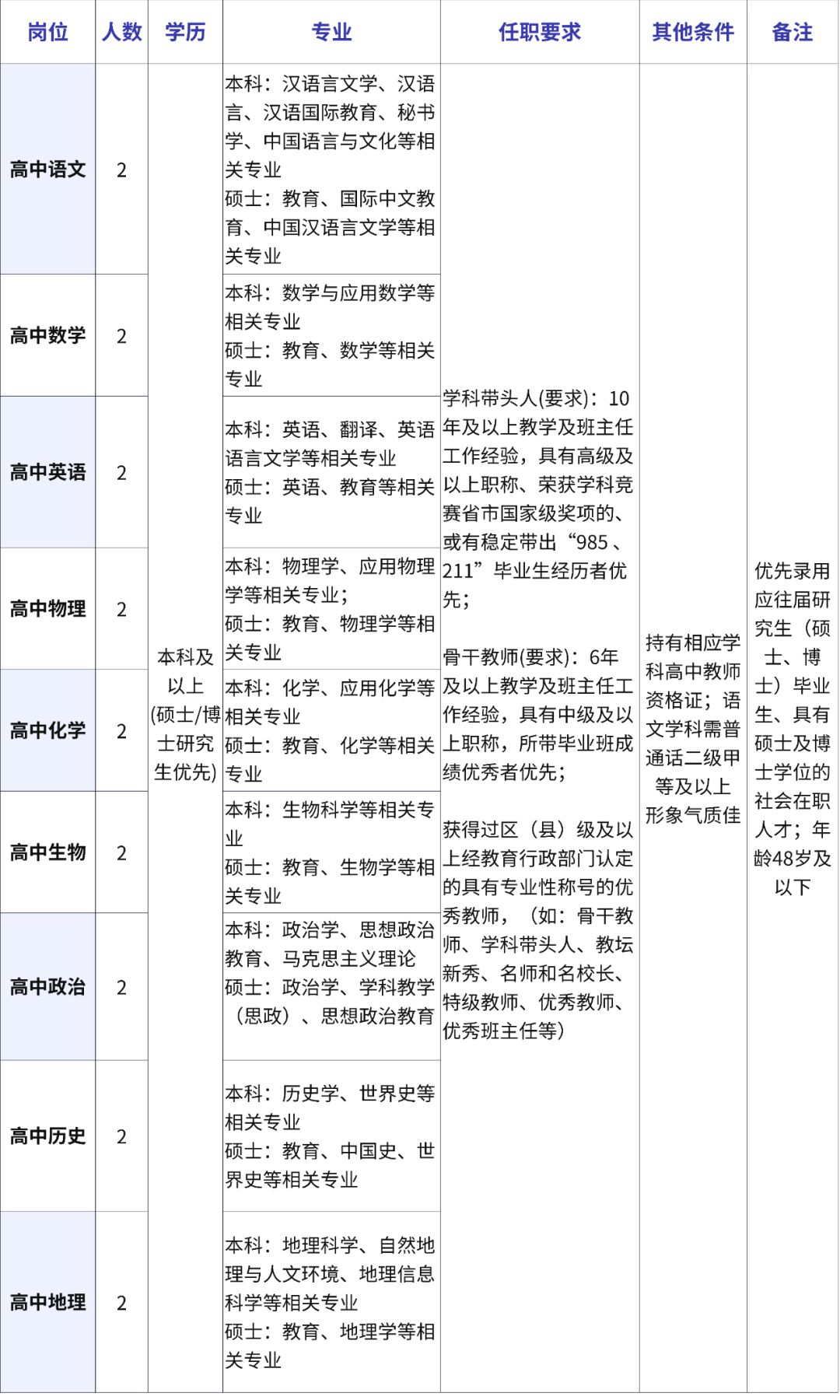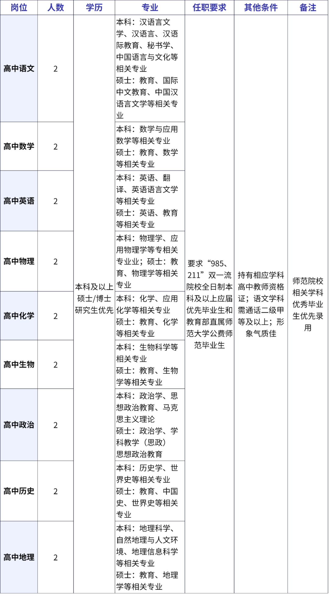 综合年薪20-30万,以岗定酬,优绩优酬;6年及以上教学及班主任工作经验,具有中级及以上职称,所带毕业班成绩优秀者优先;优先录用应往届研究生(硕士、博士)毕业生、具有硕士及博士学位的社会在职人才