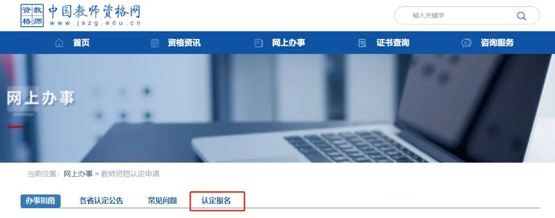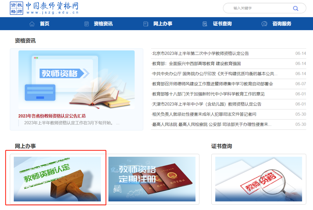 1、进入“中国教师资格网”,在“网上办事”一栏点击“教师资格认定”