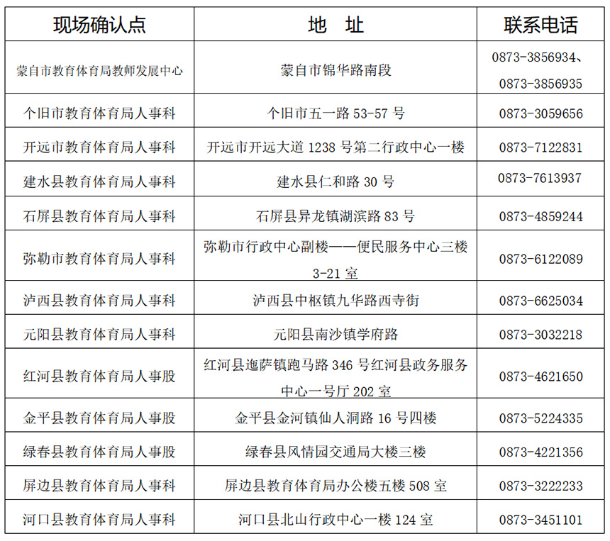 红河学院应届毕业生、红河职业技术学校(原民族师范学校)应届毕业生到设在本校的现场确认点进行现场确认。现场确认时间及地点由学校自行安排,申请人应以学校通知为准,但现场确认工作必须于本公告中现场确认时间内完成。其余符合条件的红河州辖区内普通高校应届毕业生到学校所在属地教育体育局确认点确认,请注意关注相关确认机构的公告。