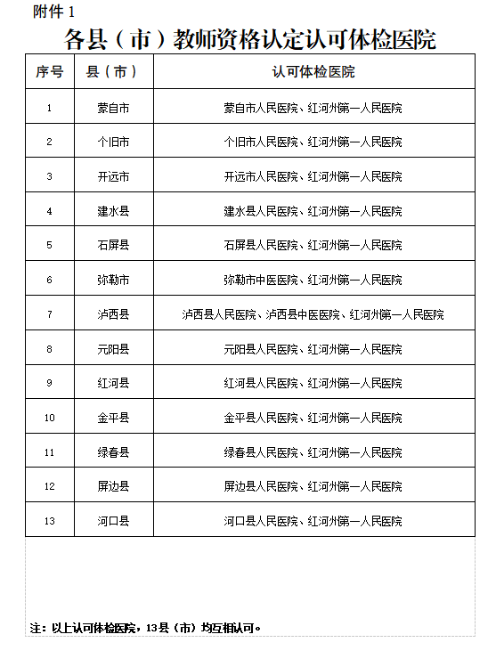 (7)《云南省申请教师资格认定人员体检表》原件(见附件1)。经红河州辖区内县级以上公立医院(具体认可医院详见附件2)体检结论签署“合格”且有体检医院意见并加盖公章的体检表原件,体检报告仅限当次认定有效。
