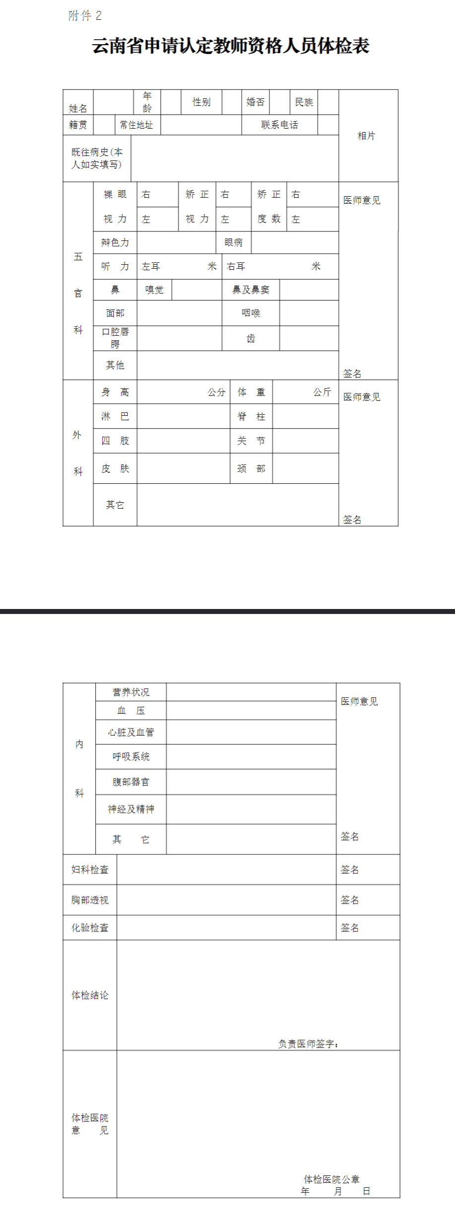 提供《云南省申请认定教师资格人员体检表》原件(见附件2),体检报告仅限当次认定有效。