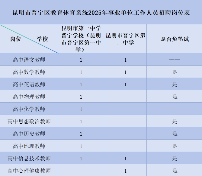 昆明市晋宁区教育体育系统2025年计划招聘高中教师14人,符合岗位条件的人员均可报考。
